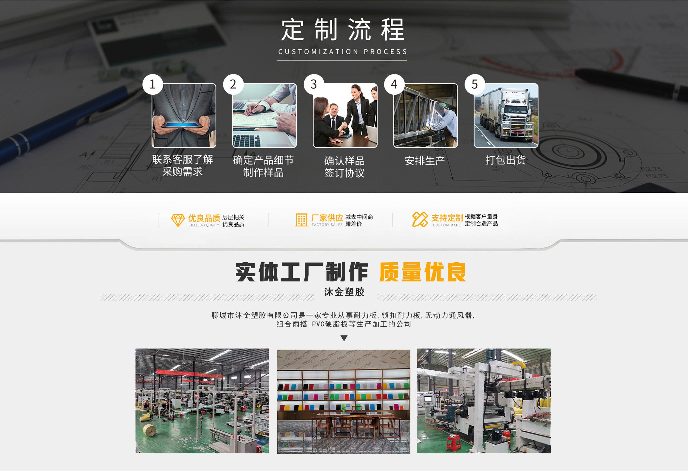 聊城市沐金塑膠有限公司注冊資金2180萬元,占地20000余平方,擁有自建廠房15000平方,員工100余名。10余年來,公司主營耐力板,鎖扣耐力板,耐力板深加工,無動力通風器,組合雨搭,PVC硬脂板,耐力板廠家等板材的發展戰略,逐漸成長為綜合性企業?! 」緭碛卸鄺l板材共擠生產線,采用世界知名品牌進口原材料和先進工藝,依據完善的ISO9001質量管理體系和ISO14001環境管理體系,為產品的卓越品質提供了強有力的保證。憑借過硬的創新能力和堅實的硬件基礎,贏創已成為國內領先的熱塑性板材生產商,產品被廣泛應用于建筑業、農業、工業、廣告業、安防行業及DIY領域?! 」臼冀K致力于通過提供最優的板材應用解決方案,為客戶創造最高的價值;堅守創新、質量、靈活、服務和速度的核心價值觀;堅持“完美的產品需要完美服務的支持”的經營理念,努力實現成為世界領先的板材與解決方案供應商的夢想?! ≡谖磥?,公司將立足客戶需求,不斷改變和完善現有產品,拓展產品線和充分開發板材的應用領域,為客戶創造全方位的價值。同時更好地實現員工的價值,實現公司團隊的價值。我們將與您一起創贏未來! 企業使命:成為世界領先的板材與解決方案供應商?! 」驹妇埃和ㄟ^提供最優的板材應用解決方案,為客戶創造最高的價值?! 『诵膬r值觀:質量...